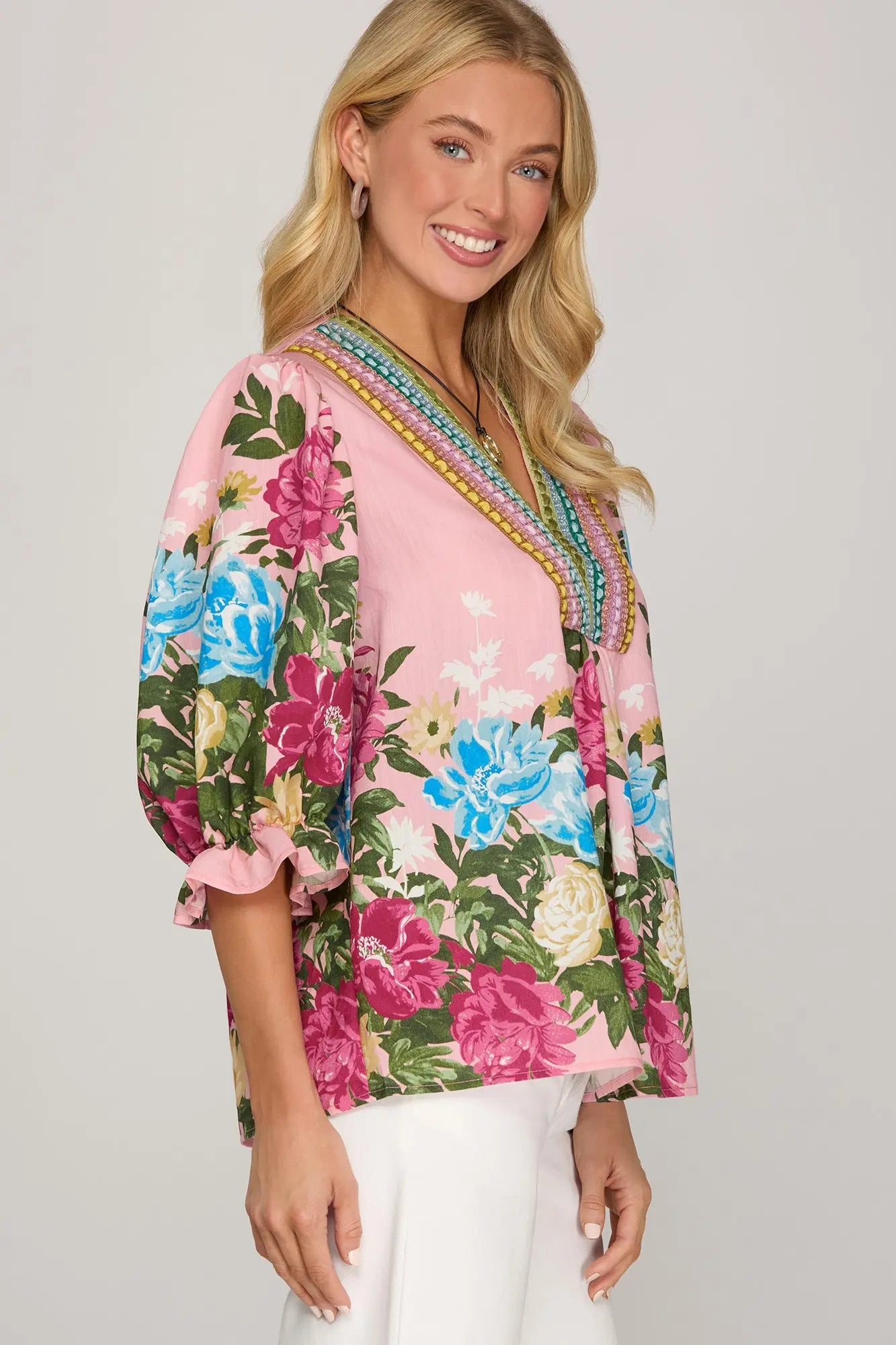 HALF PUFF SLEEVE WOVEN PRINT V NECK TOP WITH MULTI COLOR PATCH TRIM