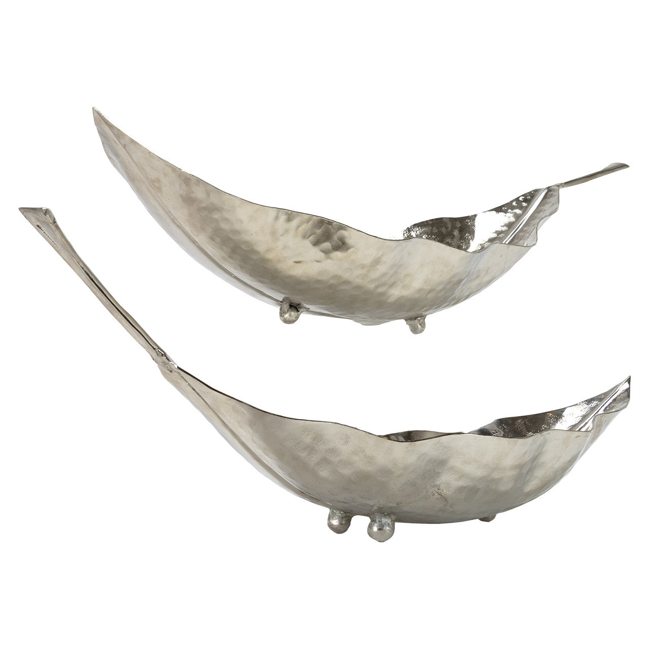 Welcome to the world of elegance with our Gum Tree Leaf Bowls. These bowls come as a set of two, with the larger one measuring 32.5L x 11W x 9.5H and the smaller leaf measuring 26.5L x 9W x 4H. The decorative leaf bowl comes alive with a shiny silver metal design that has a harmonious blend of a smooth exterior and an intimately hammered interior. Balanced on small feet, these bowls can work as decorative pieces or to hold odds and ends, adding a unique appeal to your home decor.