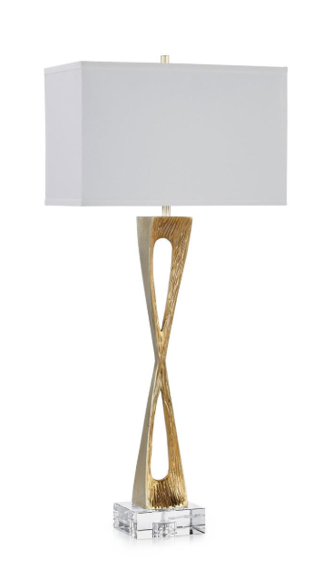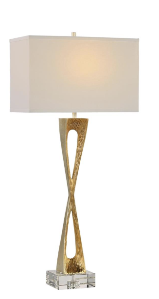 The Infini Table Lamp is a stylish, dimensional design adorned in opulent tones. The piece displays two tapering forms connecting at the points, creating an attractive loop. Adorned in a Gold finish, the body showcases a smooth surface on the outside and textural detailing in the interior. The hardware and cylinder finial match the gold tones of the body, beautifully complemented by a crystal base and rectangular white linen shade. 35"H X 16"W X 8"D