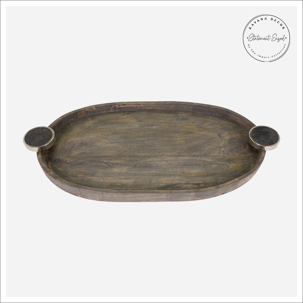 the Onofre Tray, a high-end decorative tray that will elevate any space. Crafted from solid wood in a rich brown color, this 33L x 17W x 3H oval shaped tray is a stylish addition to any home. The unique small round handles, made from marble encased by iron, add a touch of sophistication. Whether you use it for a table setting or displaying decor, this high-end tray is sure to impress your guests.