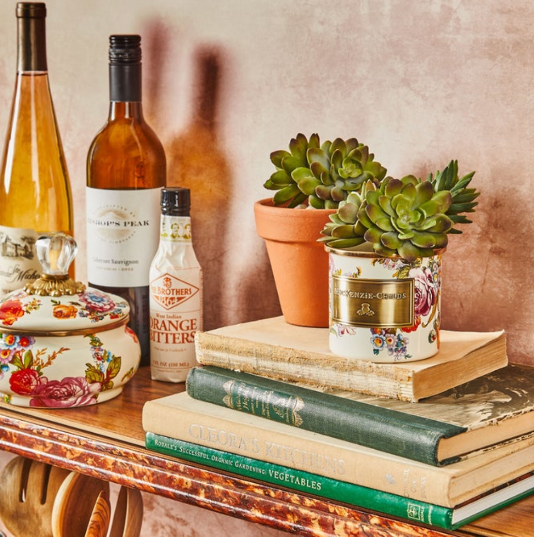 Add to the endless possibilities for our enamel canisters with the Mini White Flower Market Canister. Our smallest sized canister, the Mini stands handsomely alone or harmonizes delightfully in a set. Keep it in the kitchen or invent new uses around the house. It’s perfect for cotton balls and swabs in the bathroom, pens and pencils in the office, or knickknacks and doodads in the kids’ room. Color glazed in white, it’s decorated with hand-applied fanciful botanical transfers that recall a lush English garden in the peak of summer, and the lid is topped with a clear glass knob.