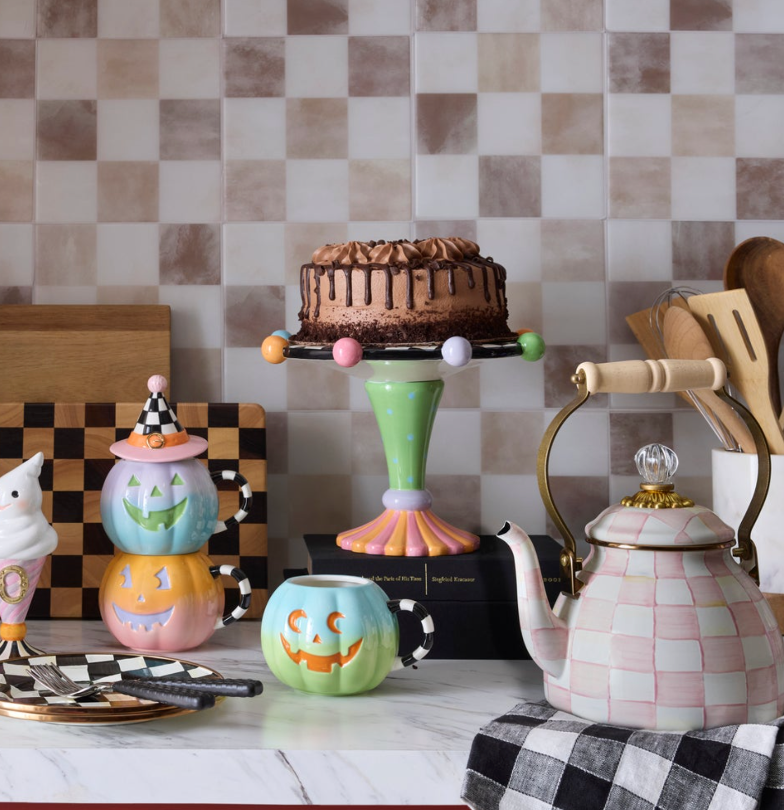 Add a playful touch to your Halloween decor with the Trick or Treat Large Ceramic Pedestal Platter. This vibrant platter, decorated with Courtly Checks and colorful baubles, is perfect for displaying your favorite Halloween treats.