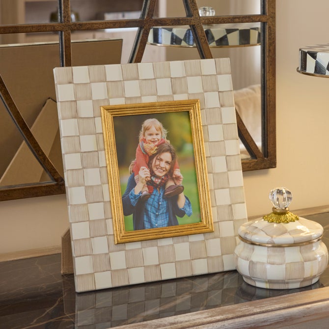 Heavy-gauge, hand-glazed steel underbody with hand-painted Mocha Checks. Glass pane. Easel back included; backing is covered with linen and a brass logo plate. Pieces may vary due to the handmade nature of each product.