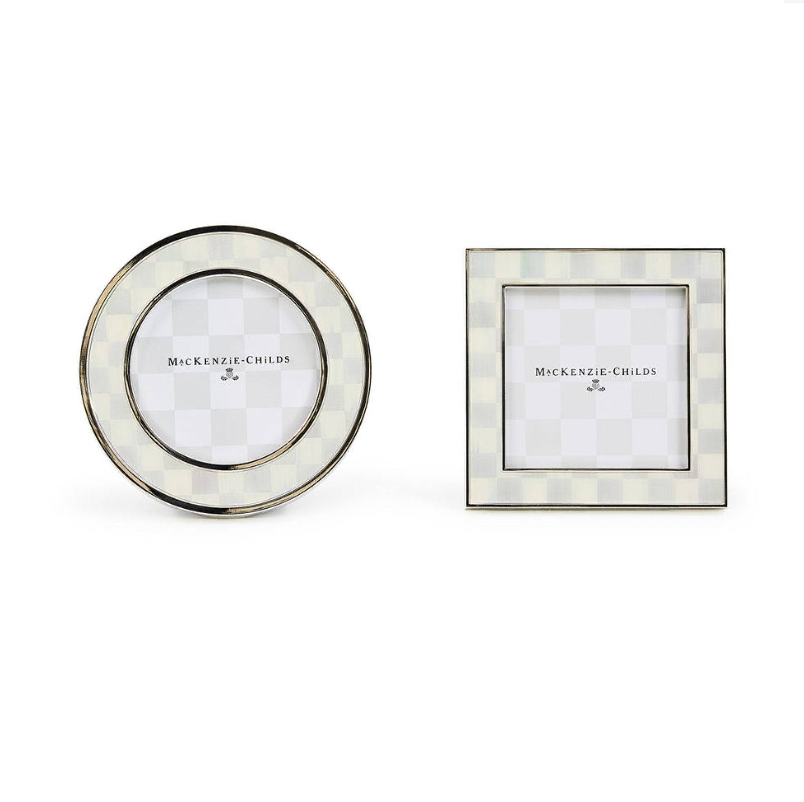 Crafted of silver plated zinc alloy with printed paper layered in an enamel finish and a glass insert. Velvet backing with an easel stand and silver stamped logo. Pieces may vary due to the handmade nature of each product.