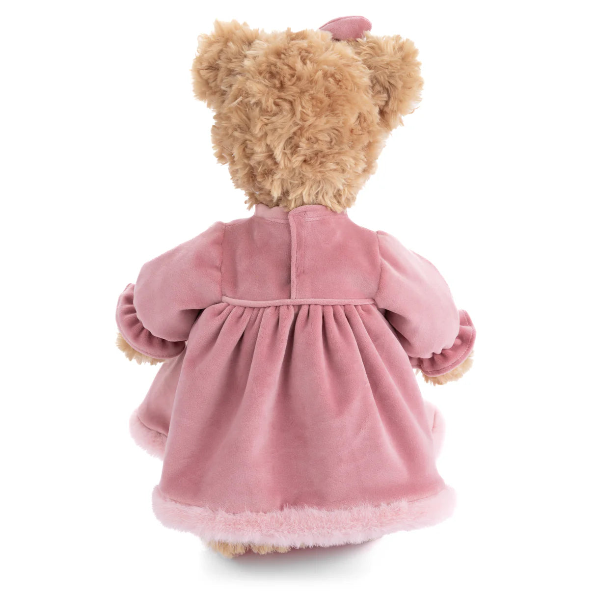 Meet Aiko, a sweetheart designed to melt hearts with every cuddle. Dressed in a blush velvet dress trimmed with cloud-soft faux fur and finished with playful pom-poms, Aiko brings heirloom charm to every nursery shelf and snuggle session. Her matching bow and fluffy booties add a touch of whimsy, while her ultra-soft caramel plush makes her irresistible to hold.      All our products are washable. We suggest hand washing gently and air drying for a long lasting lifespan.