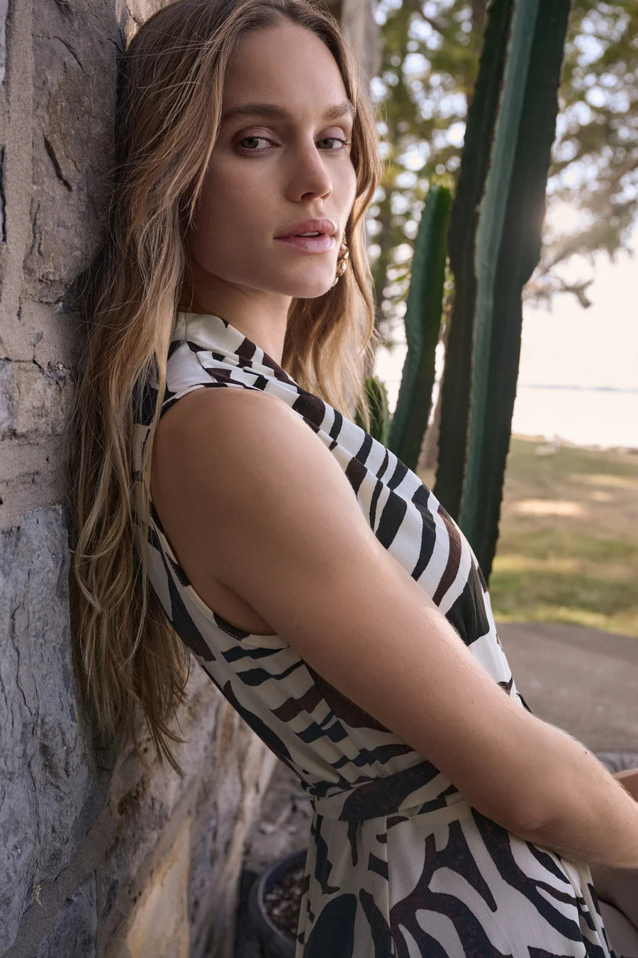 Brown & White Abstract Midi Wrap Dress