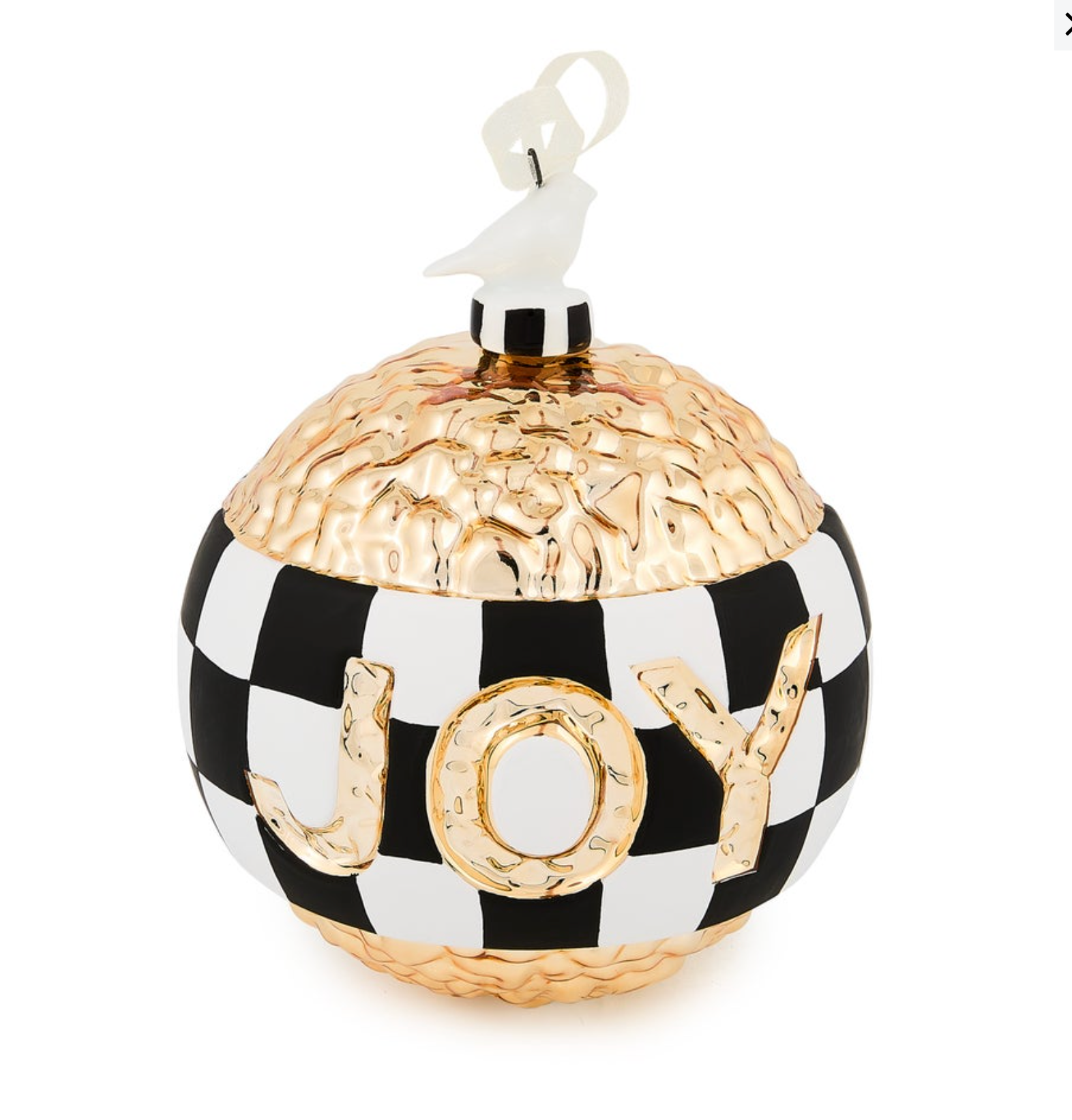 For the perfect mix of glam and classic Christmas style, look no further than the Courtly Noel JOY Glass Ball Ornament. Our signature black checks are accented by metallic gold lettering that make this large ornament a favorite for seasons to come. A wonderful gift or addition to your own Christmas tree.