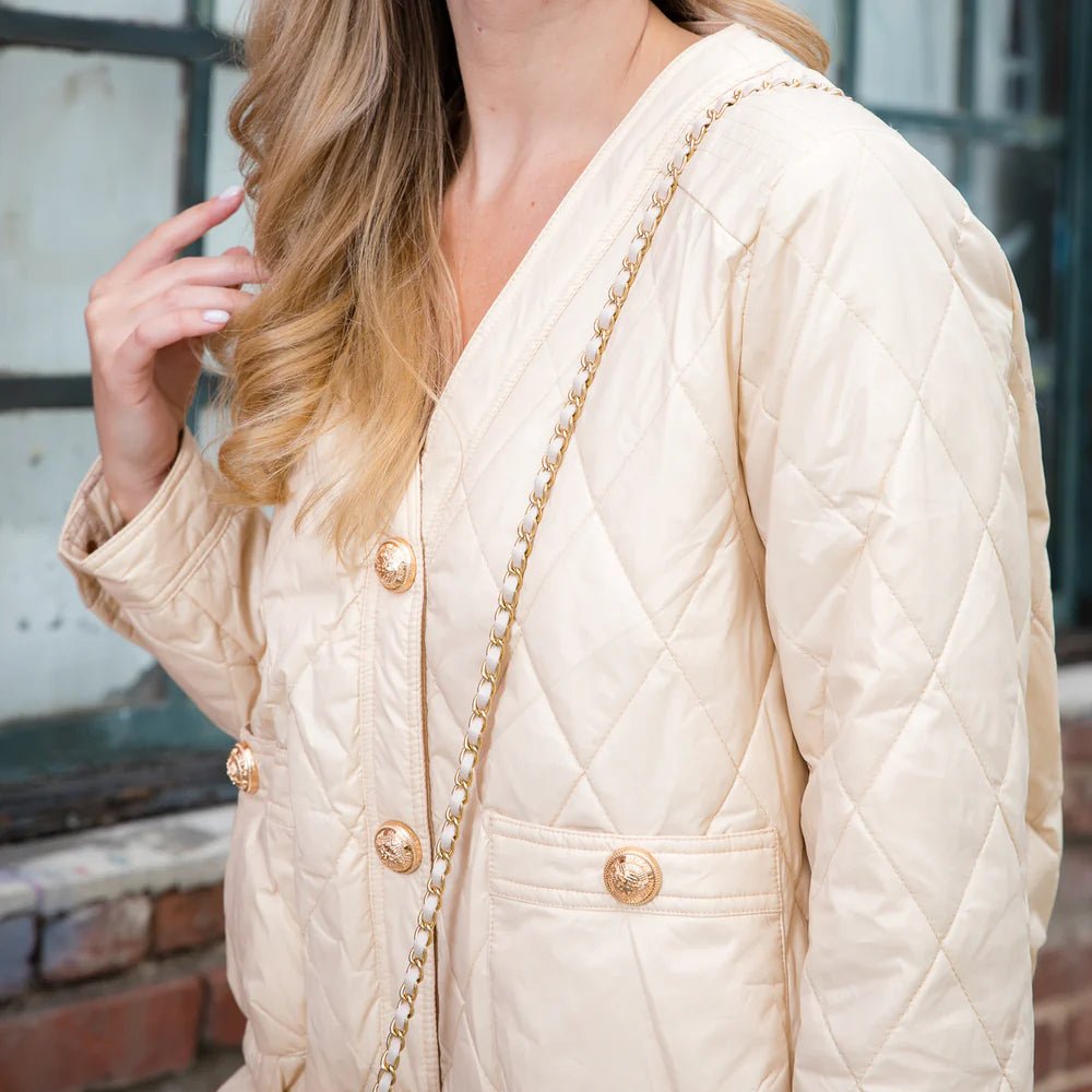 Our Johya puffer jacket with matching puffer bag. This is a set. The perfect combo. Easy relax fit. Comfort, and style. Jacket has gold trimmed snap buttons for easy closure. Light weight, keeps you warm and stylish. The matching crossbody bag has gold chain-link strap. Perfect to carry your light weight items. Don't miss out on this one !