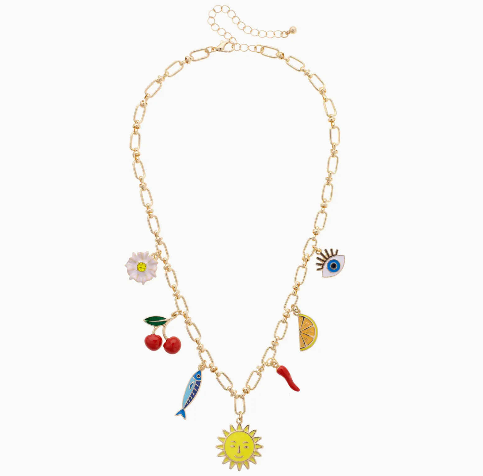 Inspired by coastal charm, this necklace features a paper clip chain accented with colorful charms. Its vibrant design brings a breezy Mediterranean vibe to your everyday look.