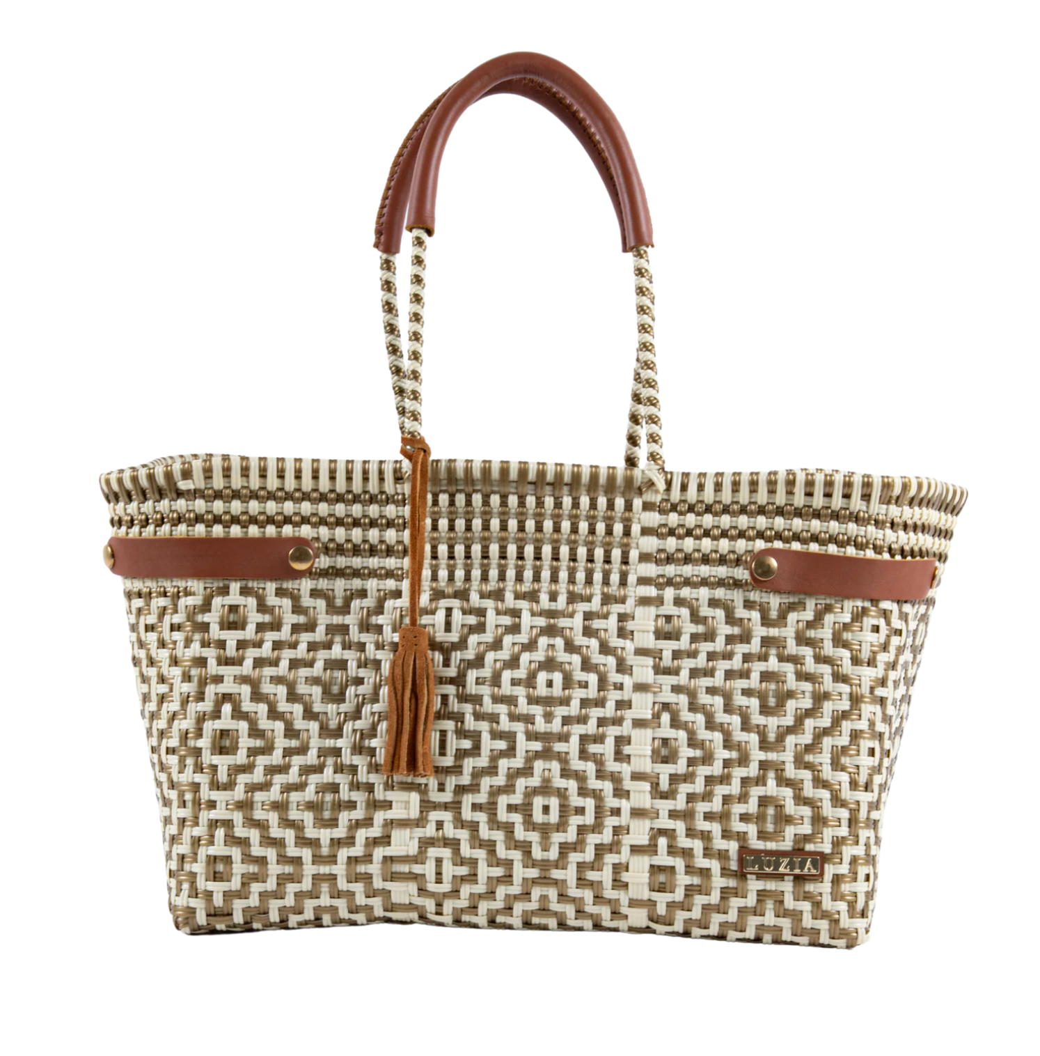 Open Basket Jumbo Cross Diamond White Gold , a beautifully handwoven basket bag crafted from premium recycled plastic . Featuring an intricate cross-diamond weave pattern , this jumbo-sized tote open-top design allows for easy access, making it the ideal companion for market runs, beach days, shopping, or travel .