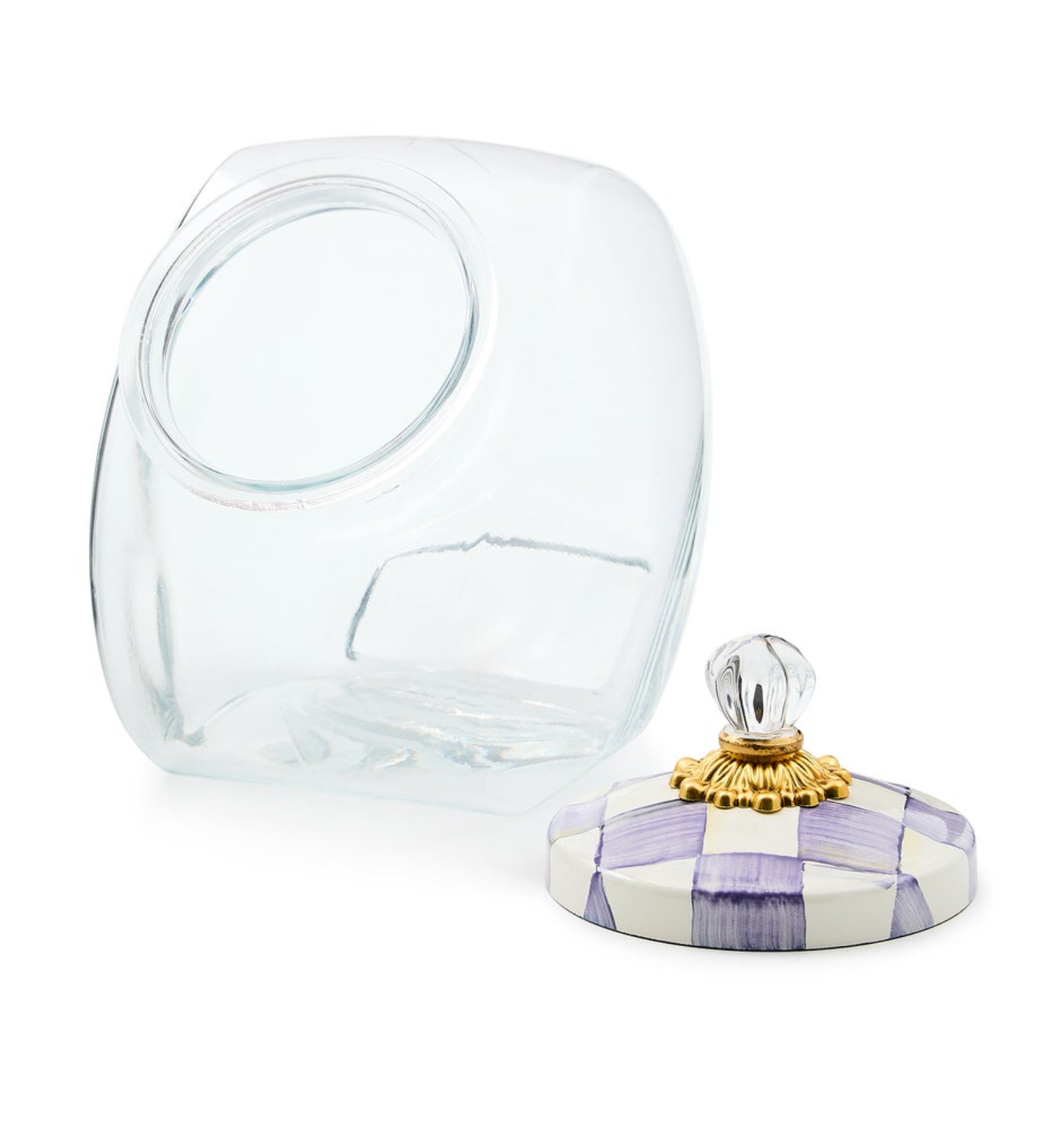 Glass jar; lid has heavy-gauge, hand-glazed steel underbody with hand-painted Violet Checks. Knob assembly includes brass bobeche and glass finial. Pieces may vary due to the handmade nature of each product.